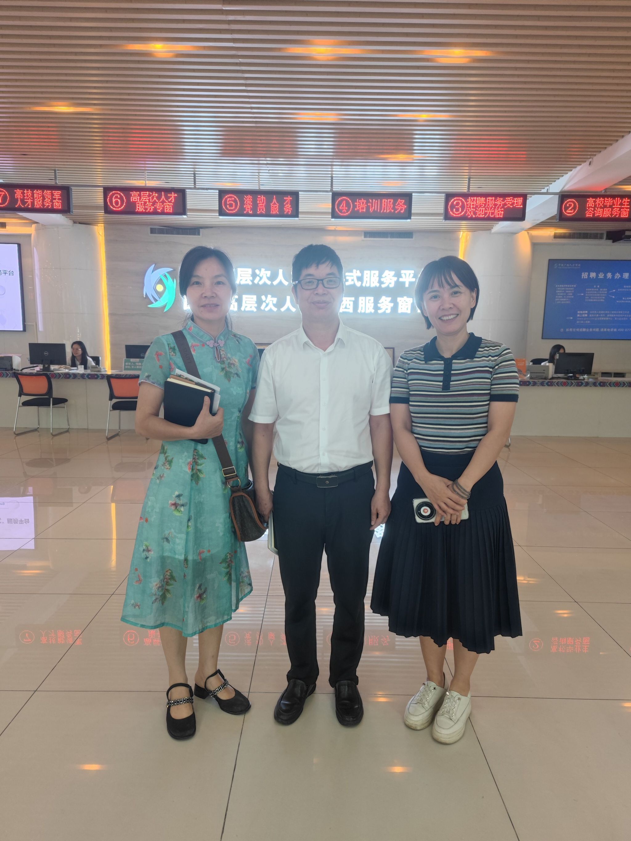 交流会上,陆院长介绍了学院毕业生的基本情况,指出本次交流的目的是了解收集毕业生专业就业信息渠道,听取关于更好推进高校毕业生就业的建议。蒙部长对自治区区人才服务中心、高校毕业生就业服务部作了简要介绍,并表示将发挥好部门桥梁纽带作用,加强与学院的交流合作,切实了解毕业生就业实际需求,主动服务大学生就业,不断提高人才供需匹配度,共同提升毕业生就业质量。同时,他也指出,高校应该针对专业毕业生多开展一些专场招聘活动,多向外省拓展就业岗位,加大与用人单位的交流力度;多引导学生关注广西高校毕业生就业服务平台的相关信息,鼓励引导毕业生到基层建功立业。最后,蒙部长带领学院毕业生就业工作领导小组,参观了广西高层次人才“一站式”服务平台暨国家高层次人才广西服务窗口,实地了解服务平台工作流程和运行管理机制。