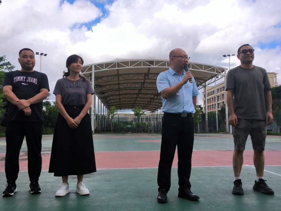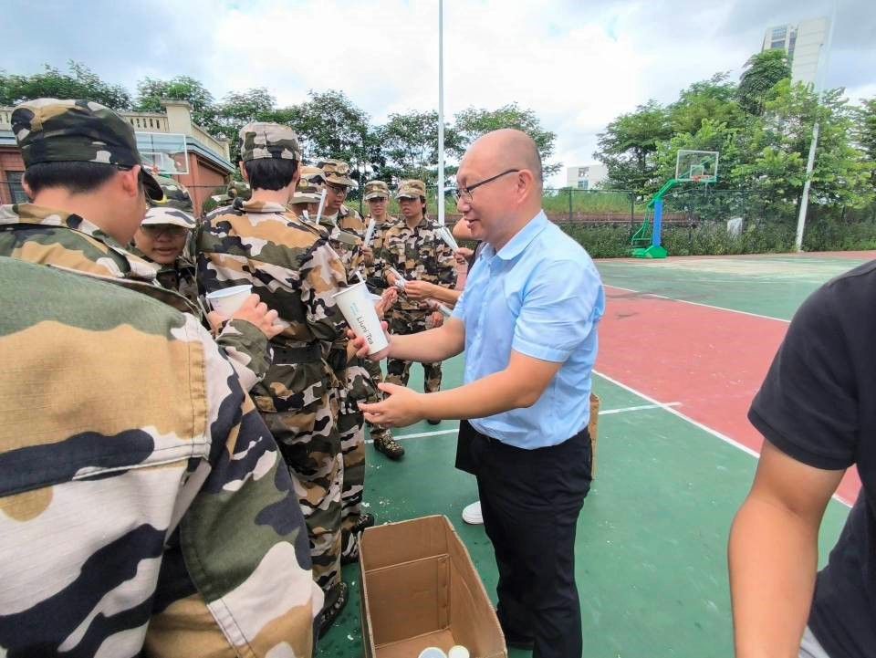 7月18日上午,学工部副部长何健、学院党委书记黎先、副书记莫雅兰等一行来到武鸣校区桂园篮球场,看望并慰问了军训教官、学院2023级全体参训同学们,