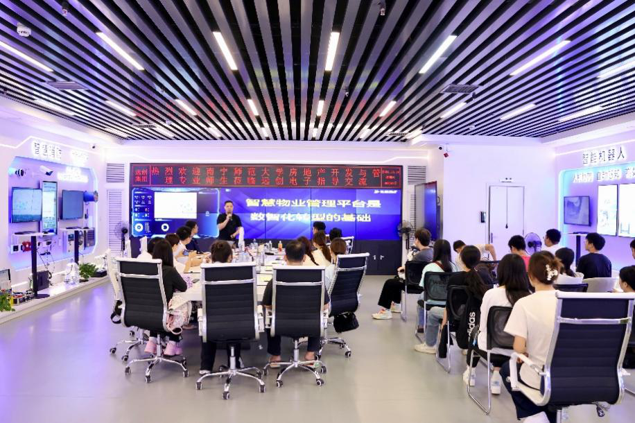 第一站,广西远创电子科技有限公司董事长韦春龙在“城市空间服务展厅”详细介绍了安消一体化全域智控中心平台,技术人员通过现场模拟、实操演示展示物业智能化设备及解决方案,韦董事长为同学们带来了一场精彩绝伦的培训,加深了师生们对智慧城市建设和安消一体化的系统认识,体验了数智化物业服务的场景。培训结束后,同学们提出疑问,韦董事长一一进行了耐心的解答。娄信强主任和黄乐老师一同对远创公司的热情接待表示感谢,并期待未来能与公司达成校企合作,深入交流。