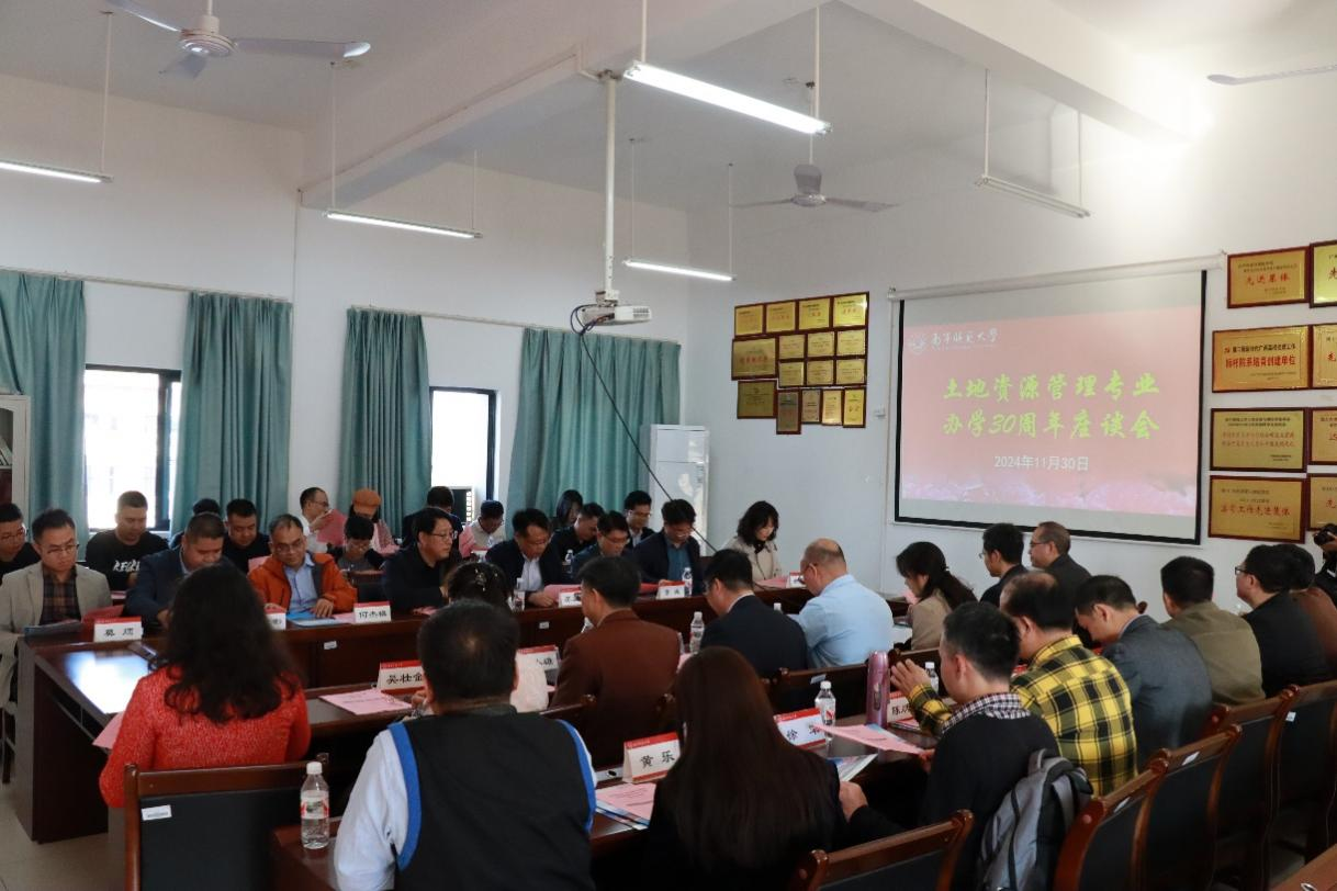 土地资源管理专业办学30周年活动在武鸣校区隆重举行。自治区人大环境与资源保护委员会副主任委员左旭阳,自治区自然资源厅办公室主任苏正国,自然资源厅执法局副局长何杰模,广西国土测绘院副院长杨旺彬,贵港市自然资源局总工程师李庆,广西英华投资有限公司董事长莫烦,广西大源农业科技有限责任公司董事长陈锦培等20多名政府部门和企业校友代表,学院领导、各系负责人、教师代表参加会议。会议由学院院长陆汝成主持。