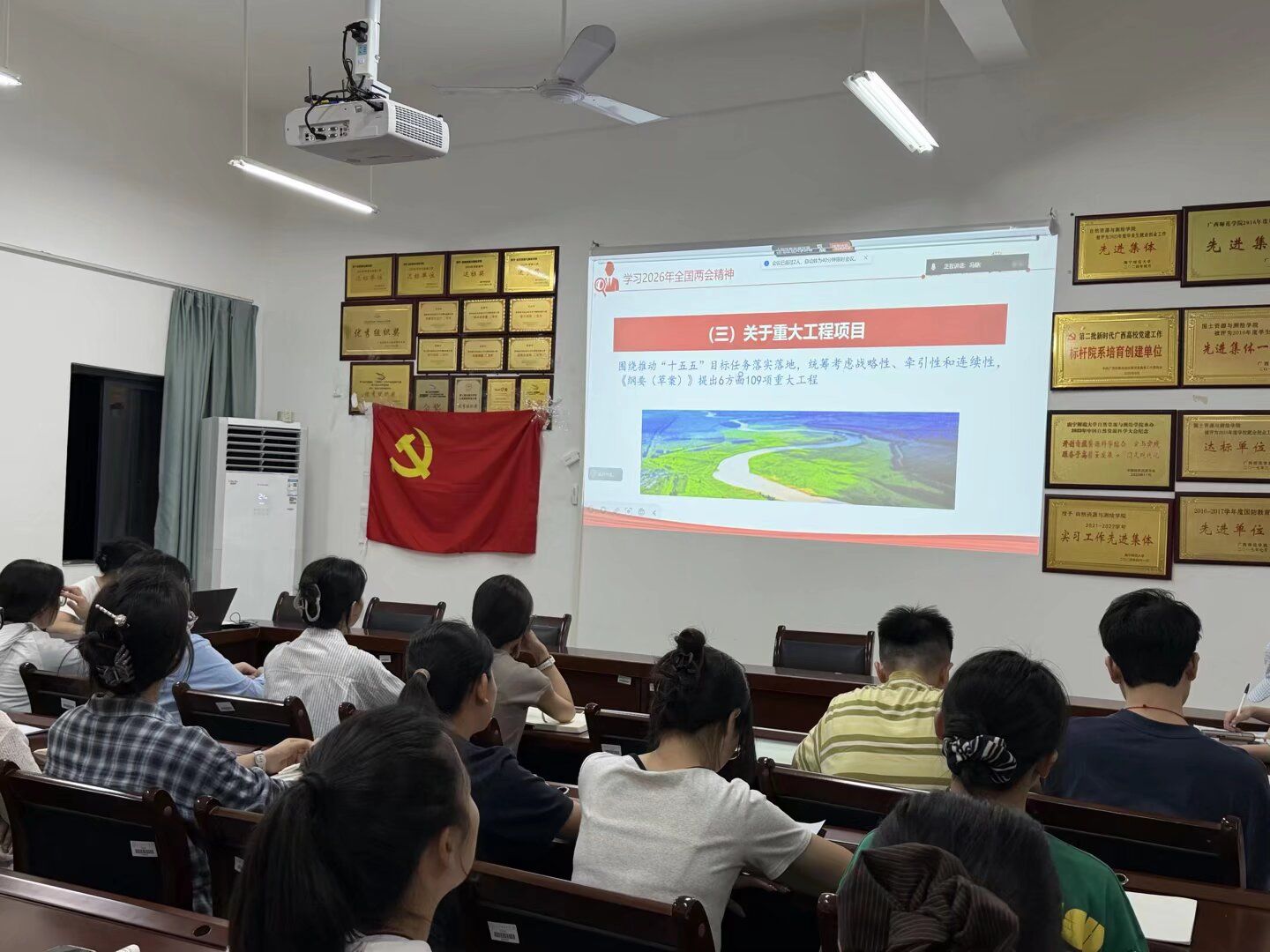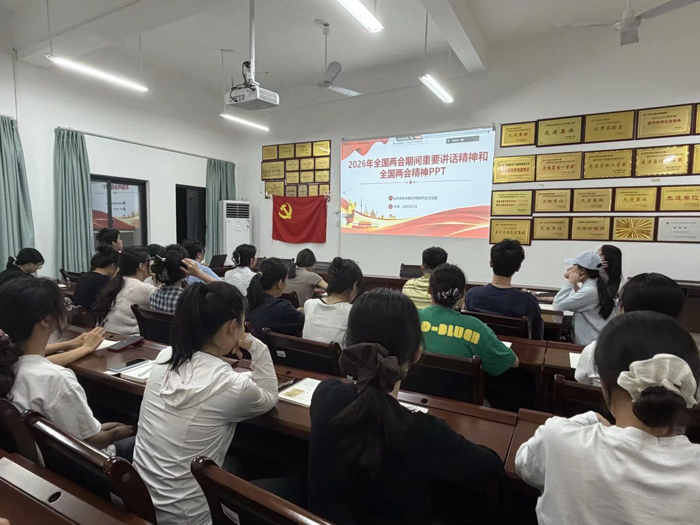 研究生党支部在武鸣校区地源楼A412党员活动室组织开展“学习贯彻习近平总书记在全国两会期间的重要讲话和全国两会精神”为主题的专题党课。本次党课由党支部书记冯静同志主持,支部全体党员同志参加。