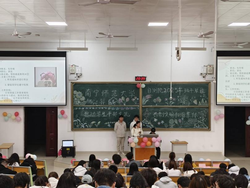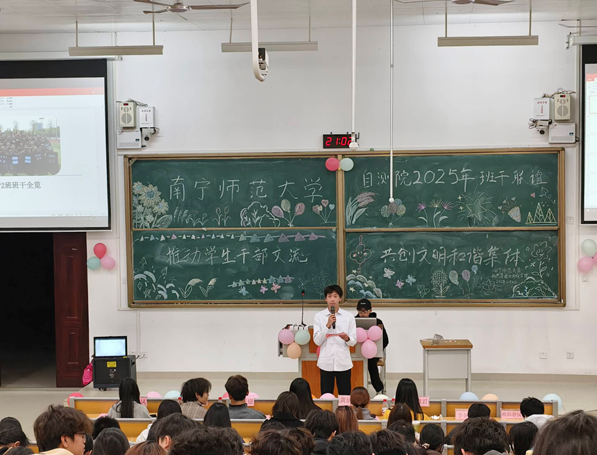学生委员会于2025年12月4日晚,在武鸣校区实验2-A105教室成功举办了以“推动学生干部交流,共创和谐文明集体”为主题的班干联谊活动。我院团委、学生会常委受邀出席,23至 25级各班学生干部及学生会代表共计百余人积极参与。